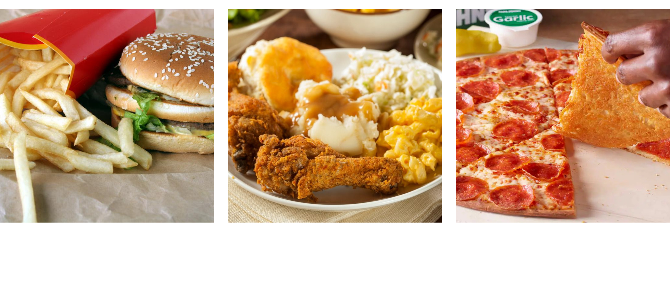 Fried chicken and mac and cheese at home. Fast food burgers and fries or takeout pizza.